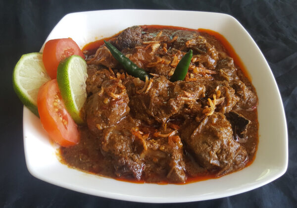 Homemade meat curry on ready-made meat curry masala. Served with a plate of rice or chapati, salad, and drink.